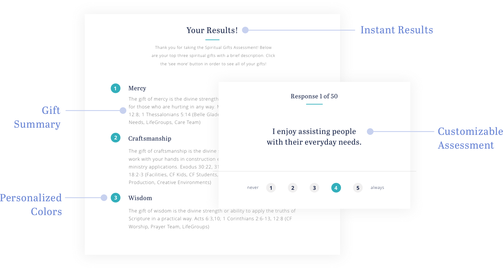 We offer a service which allows you to build a custom questionare and share it with your entire congregation. This quick assessment is a personalized and simple way to determine an individual's unique gifts.